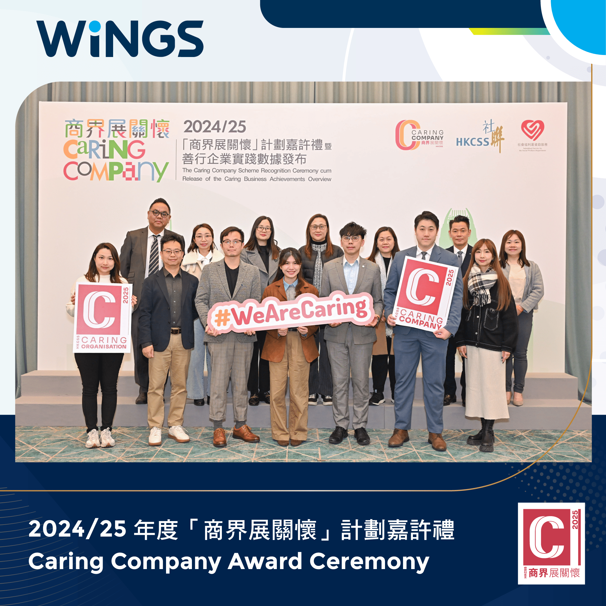 🎉 我們非常自豪地宣布,在上週舉行的「商界展關懷」計劃嘉許典禮中,WINGS 代表接受香港社會服務聯會(社聯)頒發的「商界展關懷」標誌——這已是我們連續第三年獲此殊榮!❤️ 這份肯定印證了我們持續關懷員工福祉、推動環保實踐,以及積極參與社區項目,展現了 WINGS 在企業社會責任方面的堅定承諾。🙏 感謝社聯的認可,也衷心感謝每一位同事、合作伙伴與客戶一直以來的支持!🤝 2026年,讓我們繼續以行動傳遞關懷,共同為香港注入更多正能量!